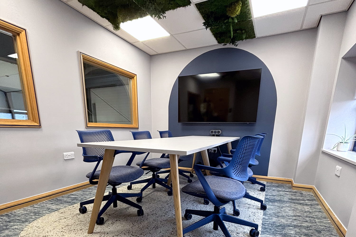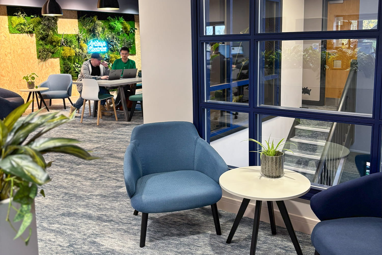 New lighting, acoustic treatments and integrated planting were introduced to improve comfort across the workspace. Within the interior, branded finishes including cork and moss feature walls help bring warmth, texture and a strong sense of identity to the space.