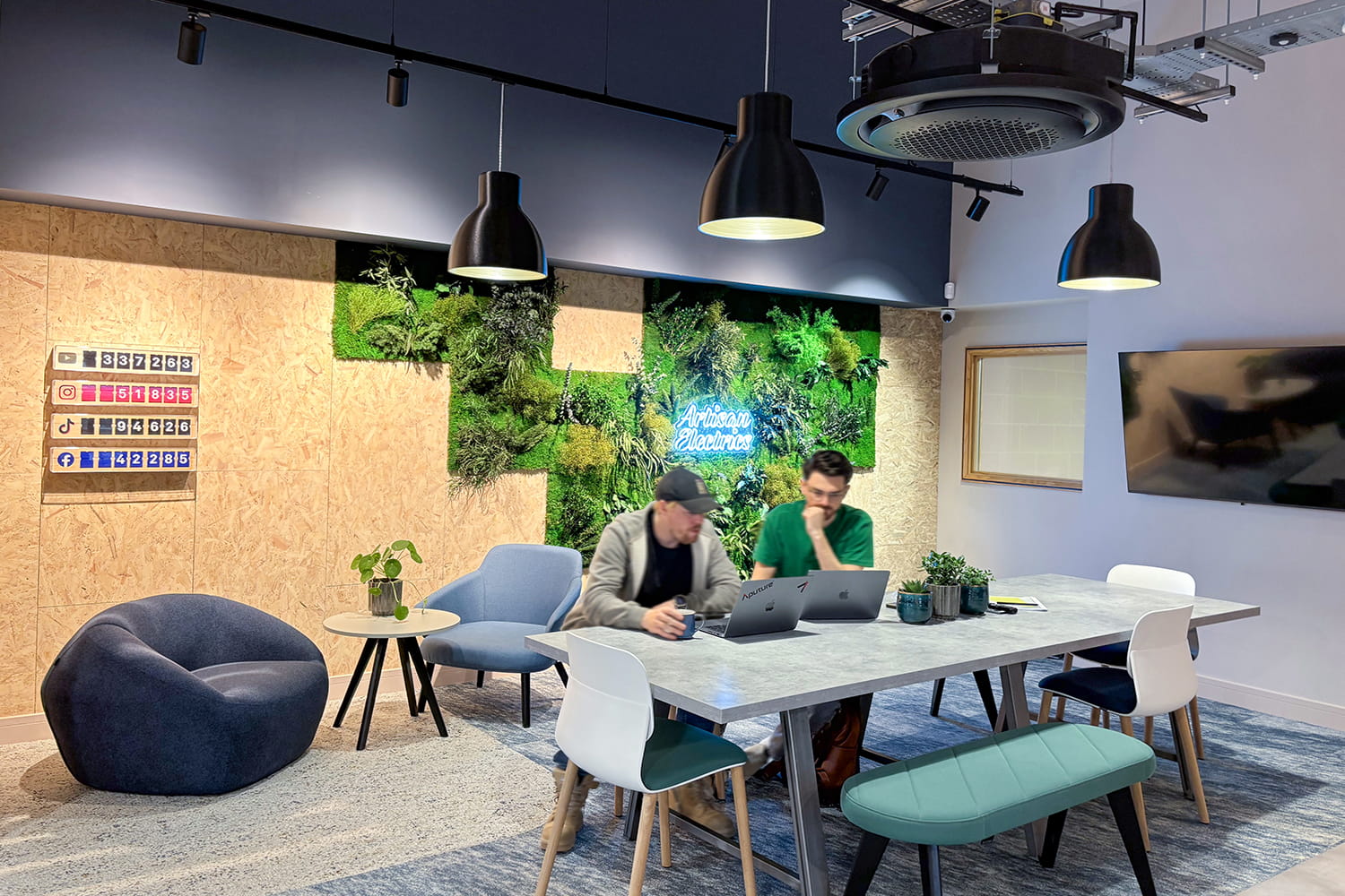 A low bench desk positioned against the branded green wall creates a practical workspace area and a clear focal point within the office. The illuminated Artisan logo helps connect the physical environment to the brand recognised by the company’s growing online audience, ensuring the headquarters feels authentic to the business.