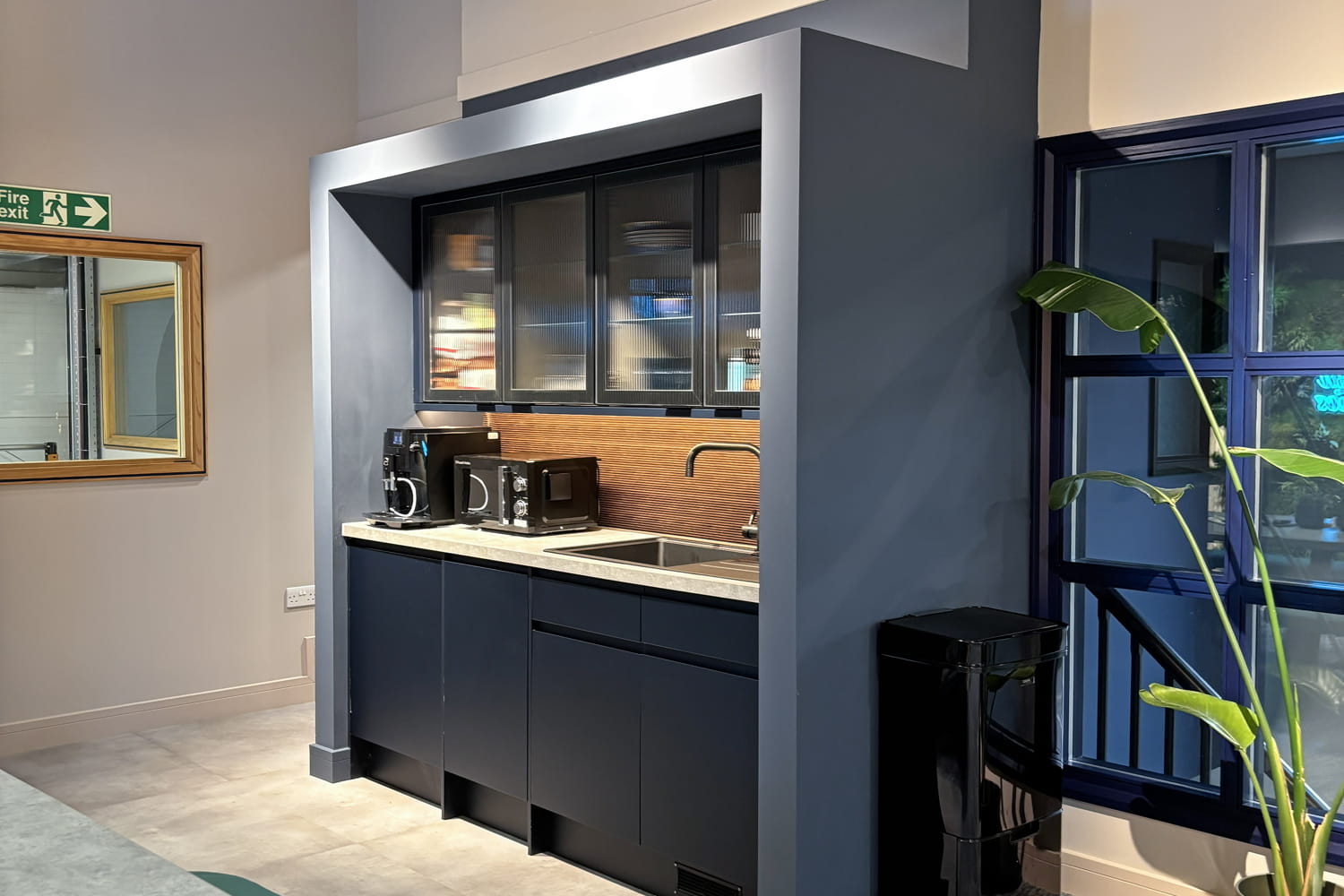 A compact tea point was introduced to act as an informal gathering space within the headquarters. Positioned close to the main working areas, it encourages the team to step away from their desks and connect throughout the working day.