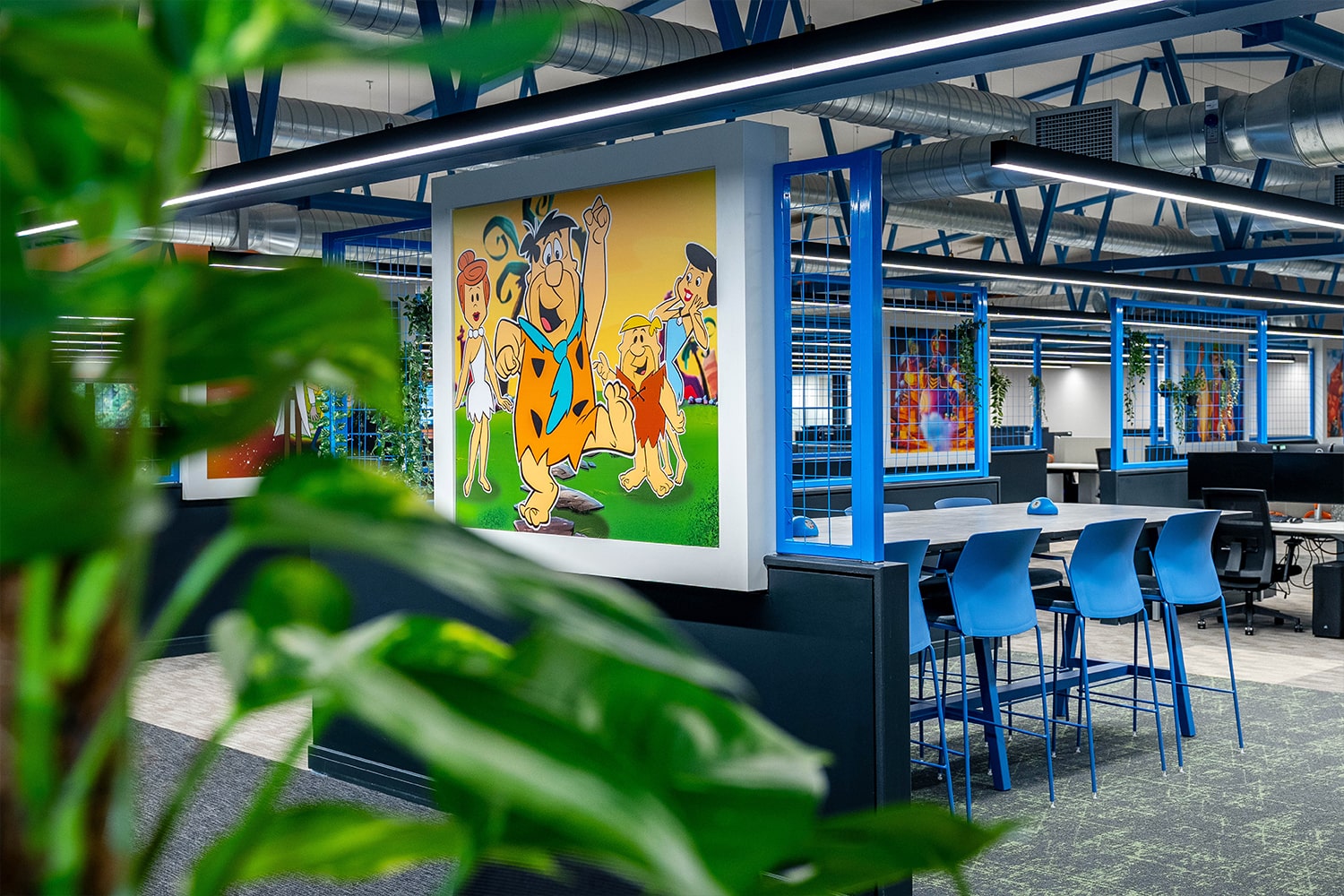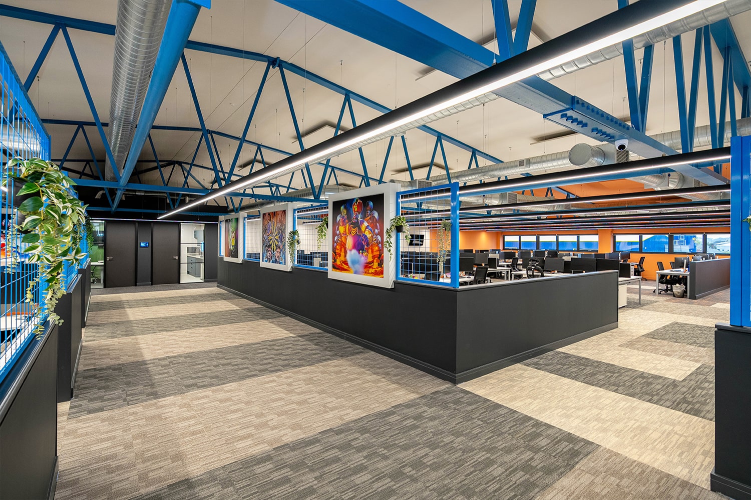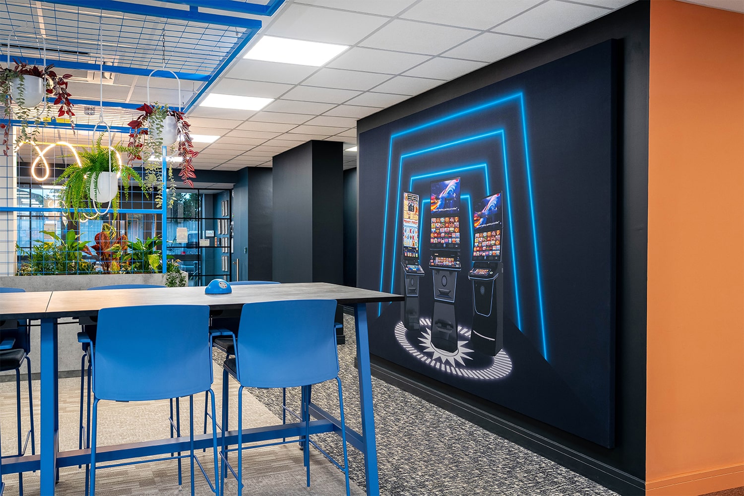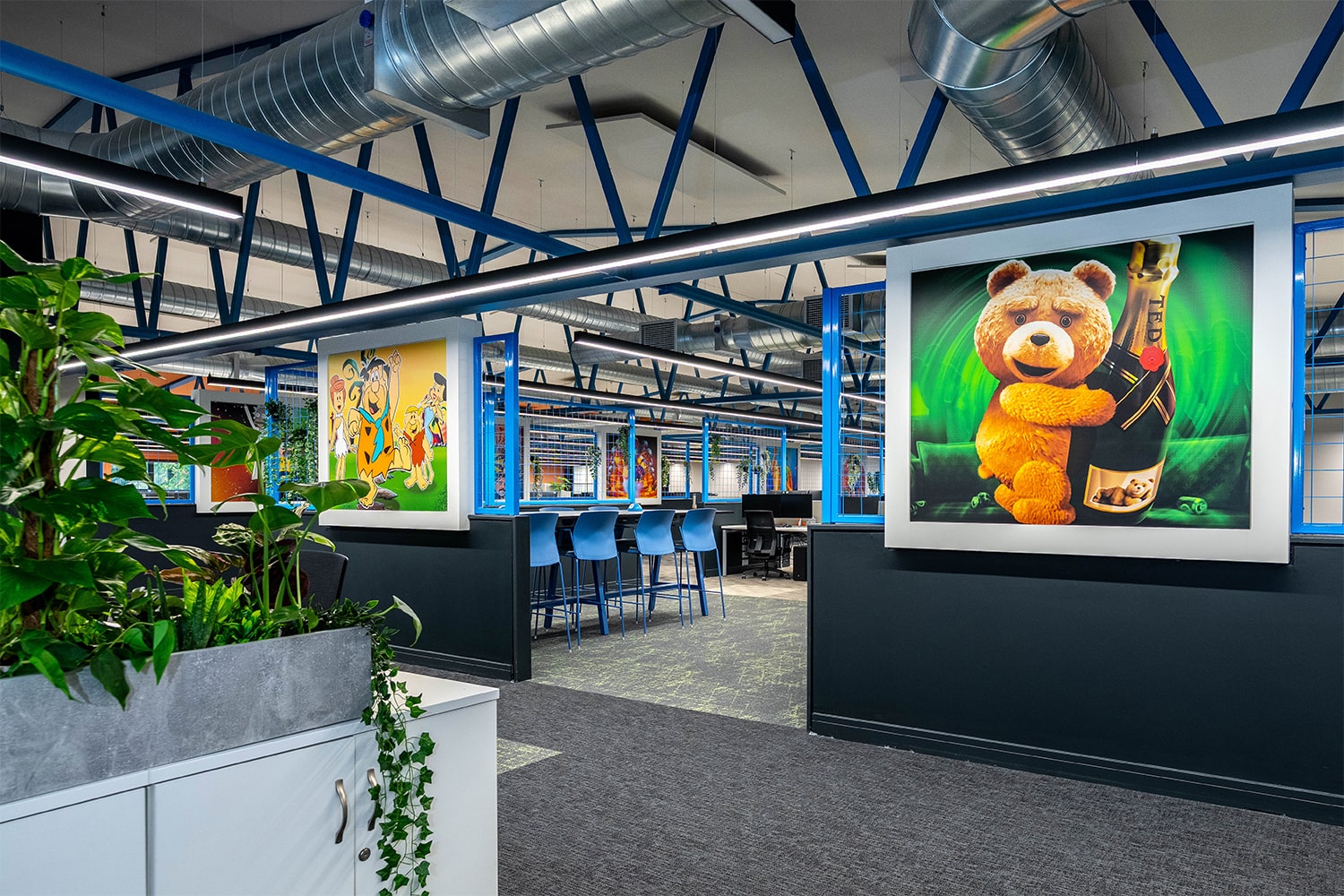Bold logos, vibrant brand colours and custom graphics tell the story of growth and success, creating a workspace that’s inspirational and unmistakably connected to the company’s vision.