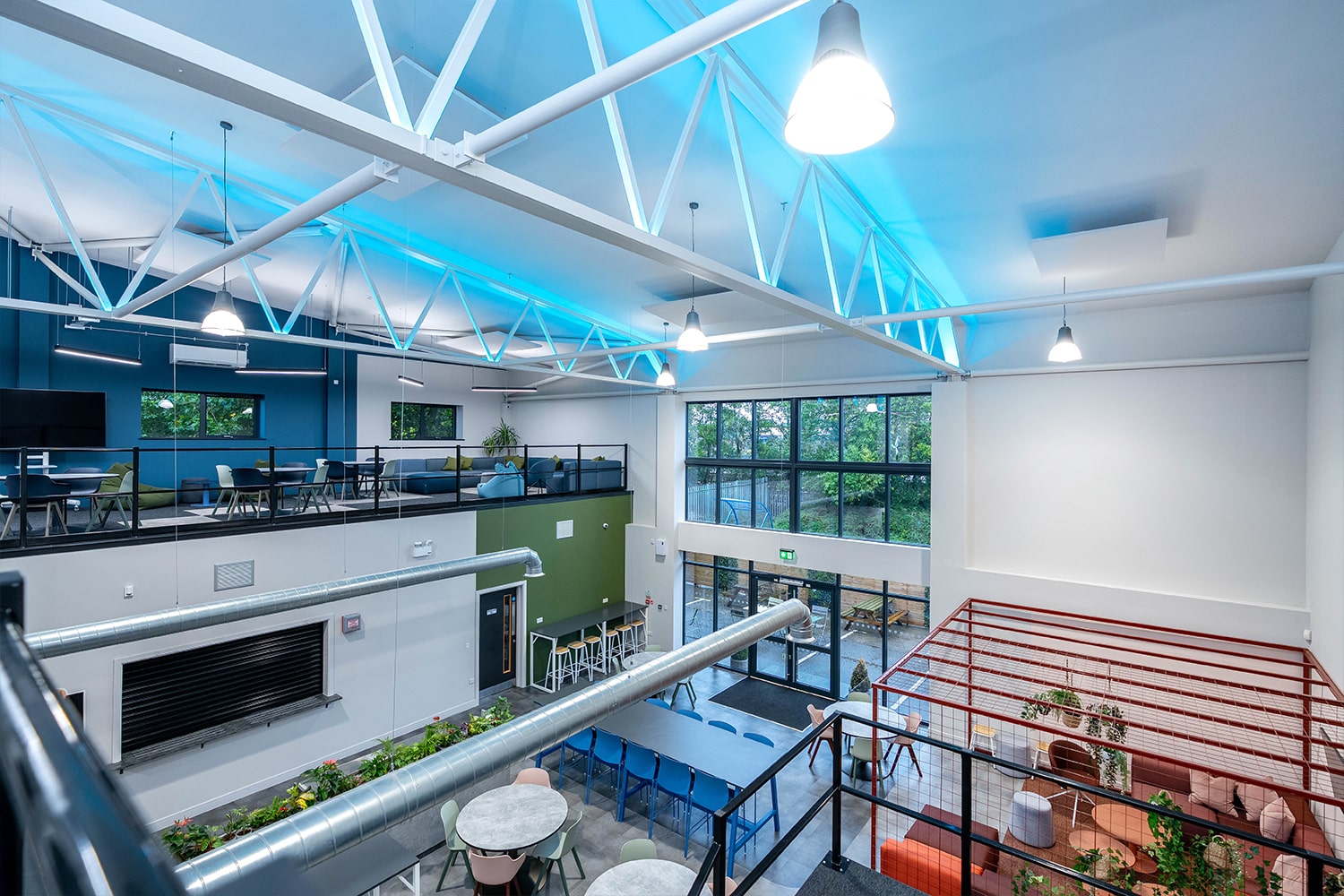 Our client, a leading global digital services provider, engaged us to deliver a cost-effective transformation of an empty industrial unit into a bold new flagship UK headquarters.